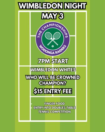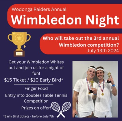 Wimbledon is here. Playing tickets will close on Thursday the 11th of July! Where: Wodonga Raiders Club rooms  When: Saturday 13th of July Time: Starts at 7pm, tennis commences at 7:30pm sharp Theme: Wimbledon whites  Some food will be provided, drinks available at the bar!  See you all there to crown our new Wimbledon CHAMPIONS!