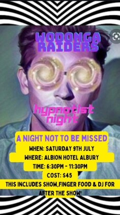 Join us on the Mystery Bus Trip - July 15th (PLEASE NOTE 18YEARS AND OVER ONLY) Departing Raiders at 8.00am - Destination YARRAWONGA... Spend the day playing, spectating and supporting your Club. Departing Yarrawonga at 5.45pm - Destingation WODONGA...2 MYSTERY STOPS ALONG THE WAY before  ARRIVING at EDWARDS TAVERN WODONGA..  ONLY 57 Seats available - GET IN QUICK Tickets $32